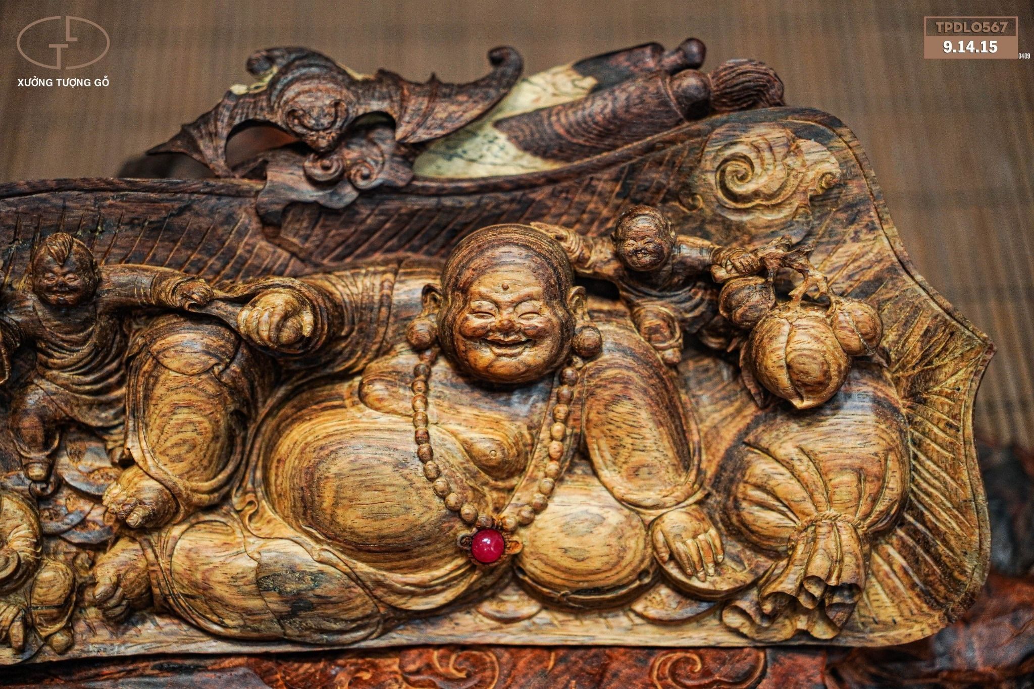 Tượng di lặc ngũ phúc bằng gỗ gắn liền với hình ảnh của 5 hoặc 6 đứa trẻ đang chơi đùa xung quanh, đứa thì nheo tai, đứa thì véo mũi, đứa xoa đầu…nếu chỉ là nhìn sơ qua thì ai cũng thấy cảnh tượng hỗn độn, không có bố cục rõ ràng. Nhưng thực tế, ý nghĩa củahình ảnh tượng di lạc gỗ ngũ phúc này là mang ý nghĩa con đàn cháu đống, lúc nào cũng vui khẻ khỏe mạnh, vô ấu vo lo. Một hình ảnh gia đình thật tuyệt vời mà ai ai cũng hằng mơ ước.