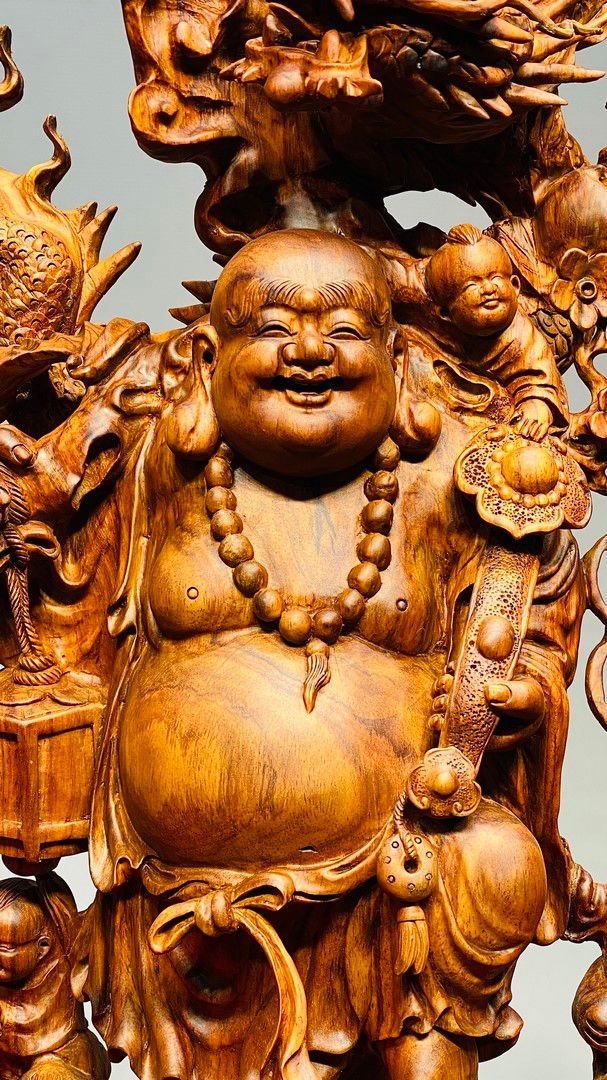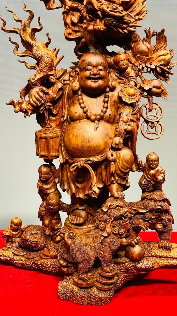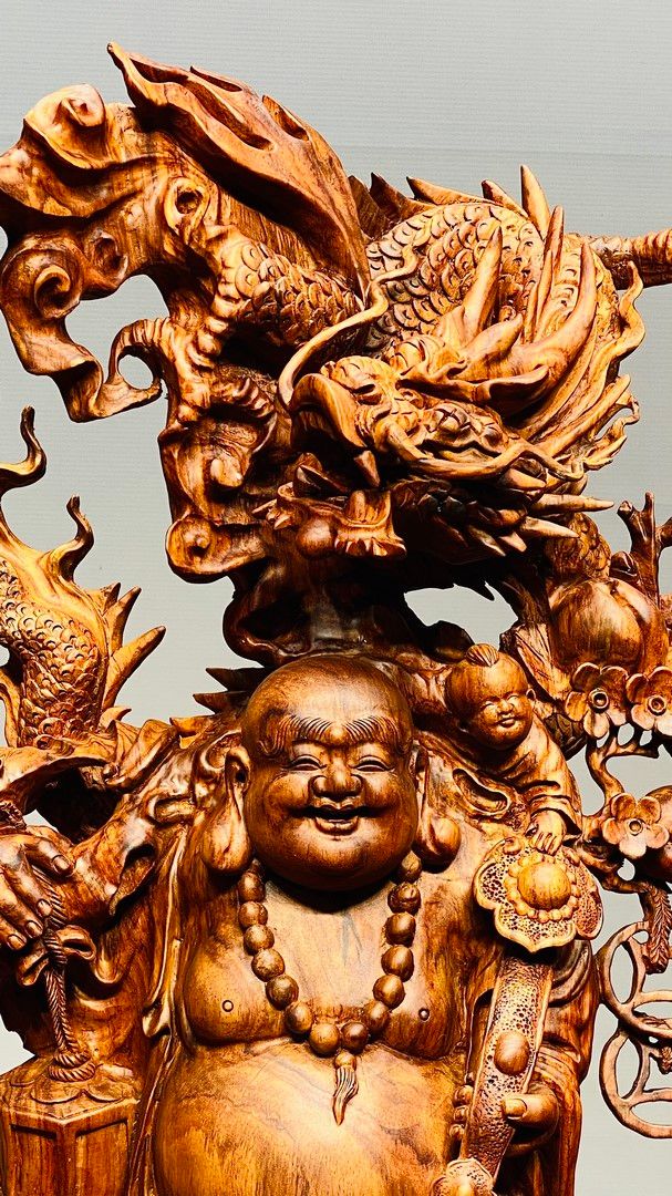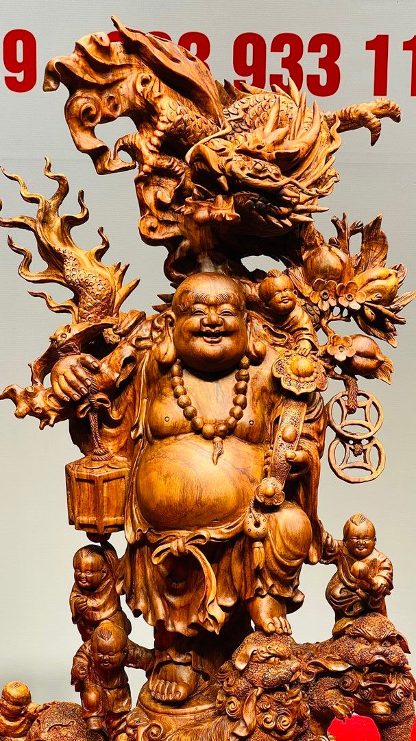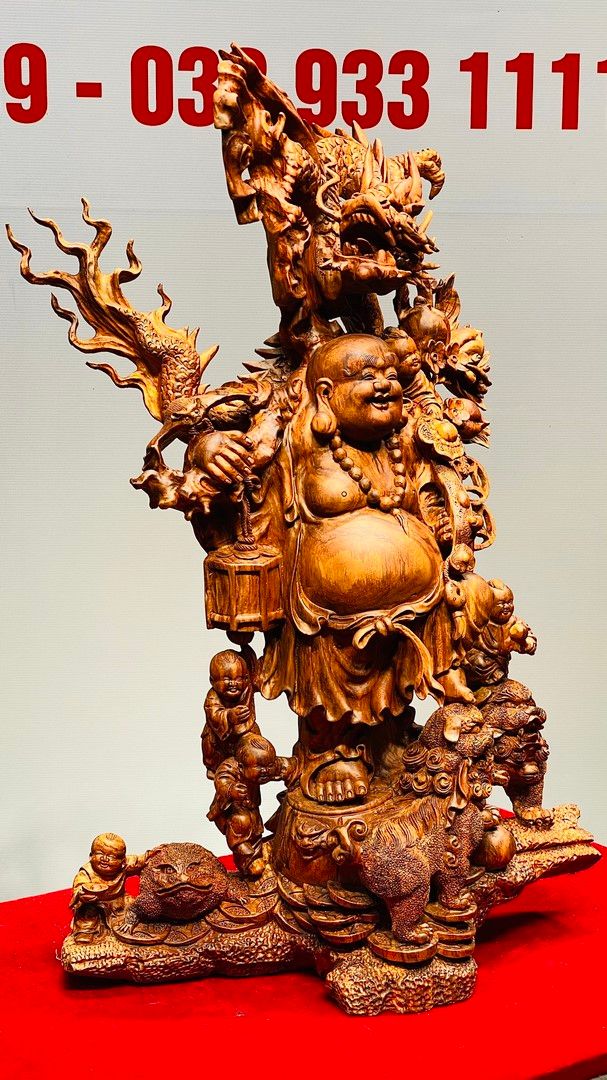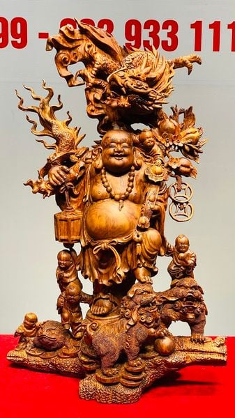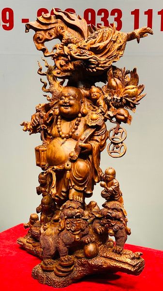 Di Lạc Ngũ Phúc vác đào đứng Long Nghê Gỗ Sưa