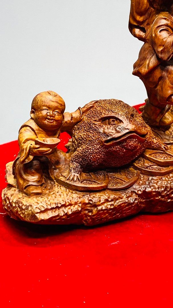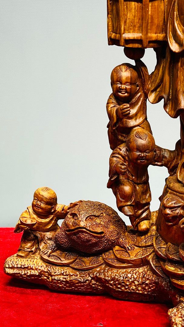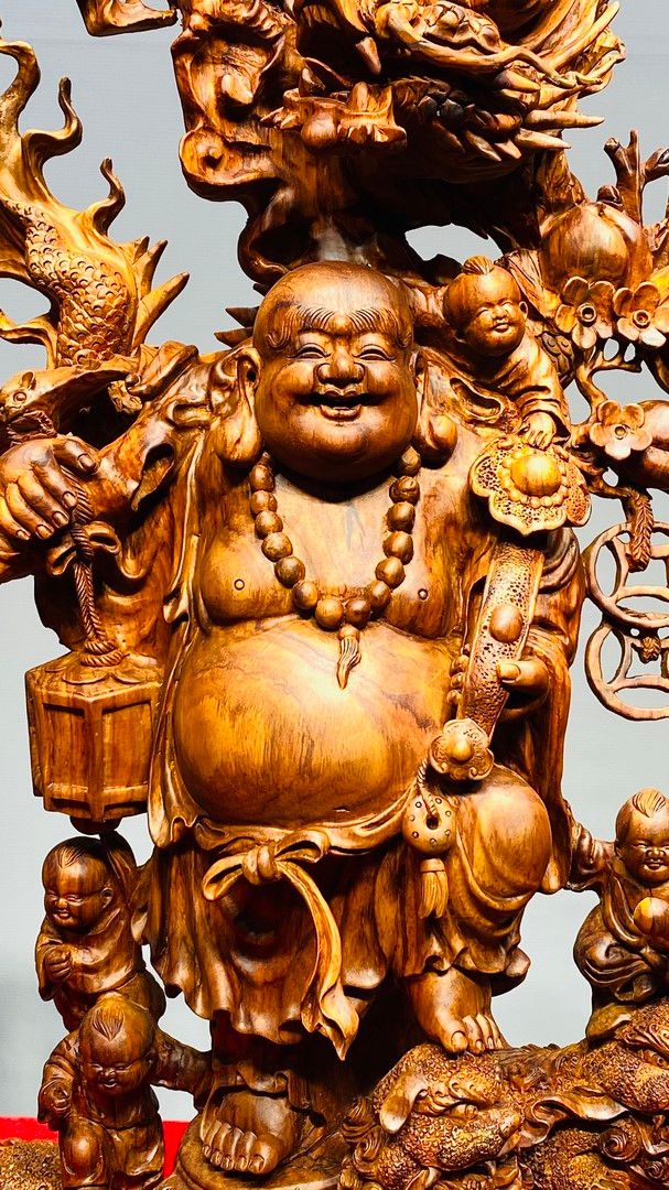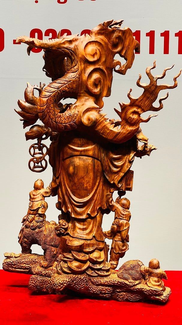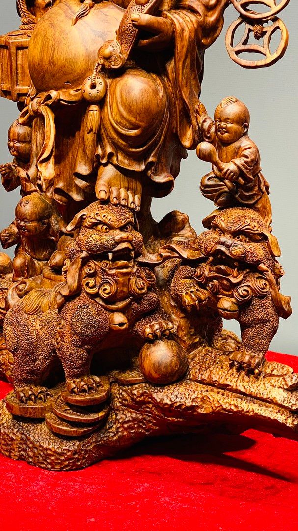 Di Lạc Ngũ Phúc vác đào đứng Long Nghê Gỗ Sưa
