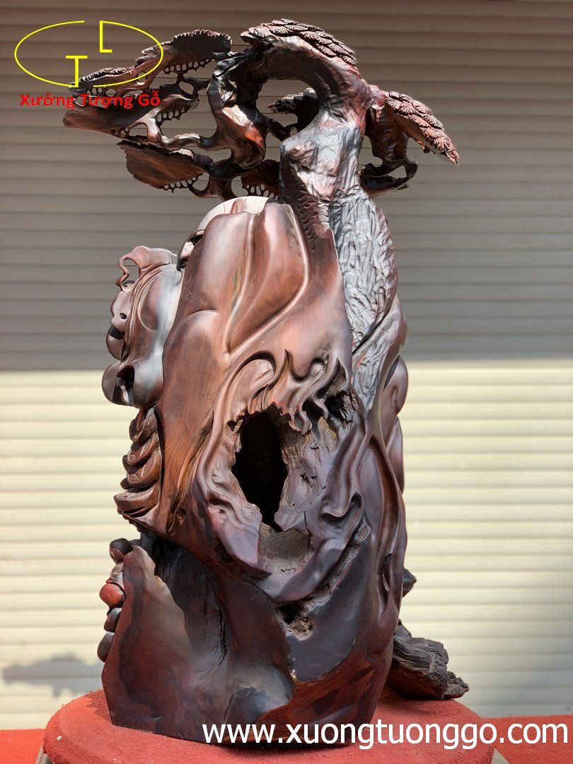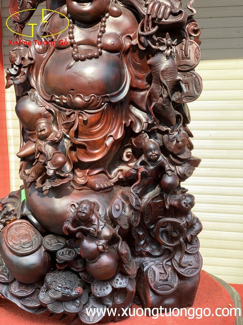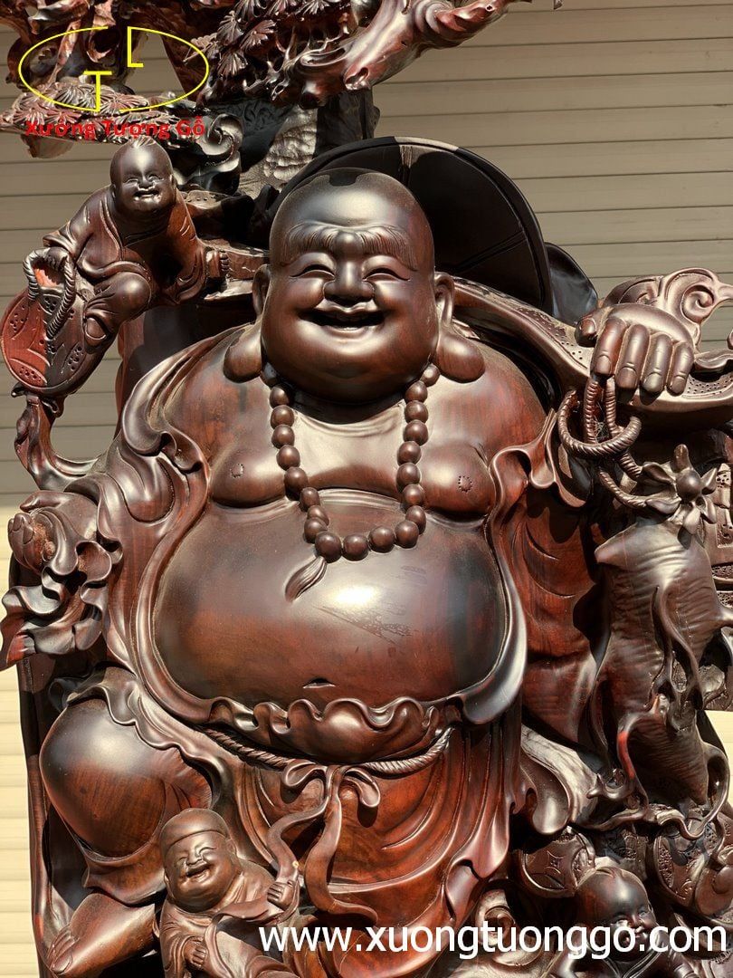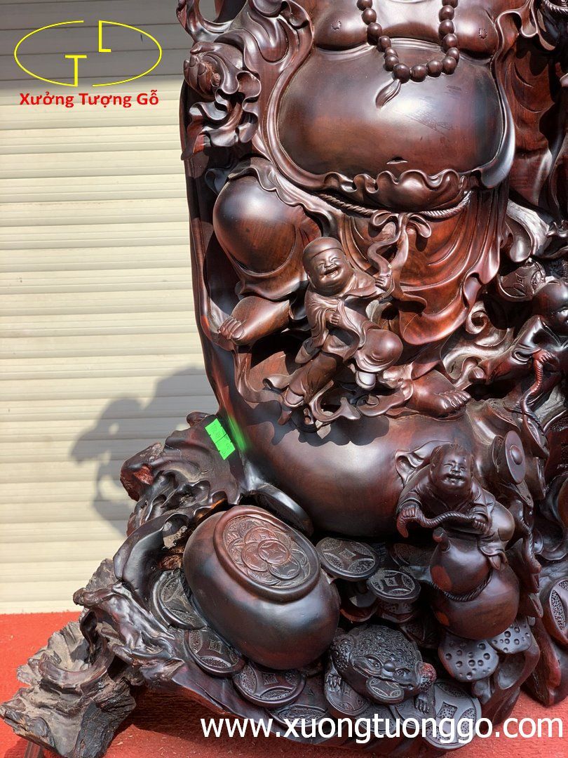 Di lặc ngũ tiểu đứng bao tiền cây tùng trắc.