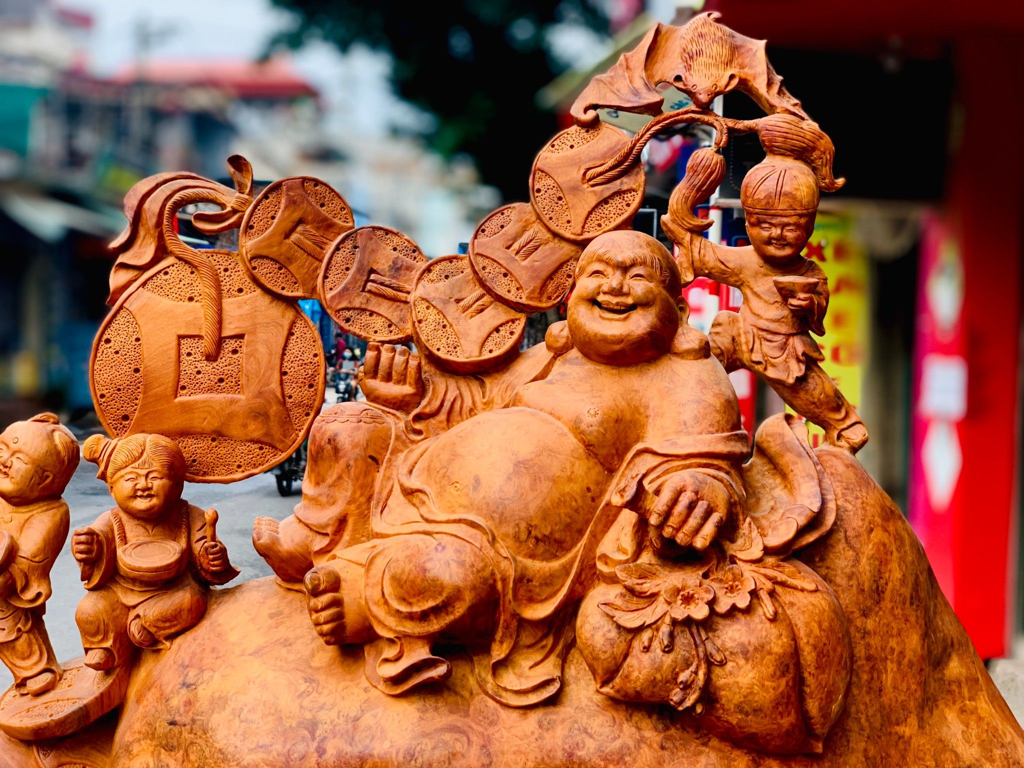 Tượng di lặc ngũ phúc là bức tượng gồm di lặc và 5 tiểu đồng đang đùa nghịch cùng ngài ý nghĩa đầu tiên ta thấy là con đàn cháu đống,luôn ngập tràn tiếng cười . Có nếp có tẻ gia đình đều huề, an vui. 5 tiểu đồng còn biểu hiện cho tượng trưng cho " Phúc-Lộc-Thọ-Khang-Linh".