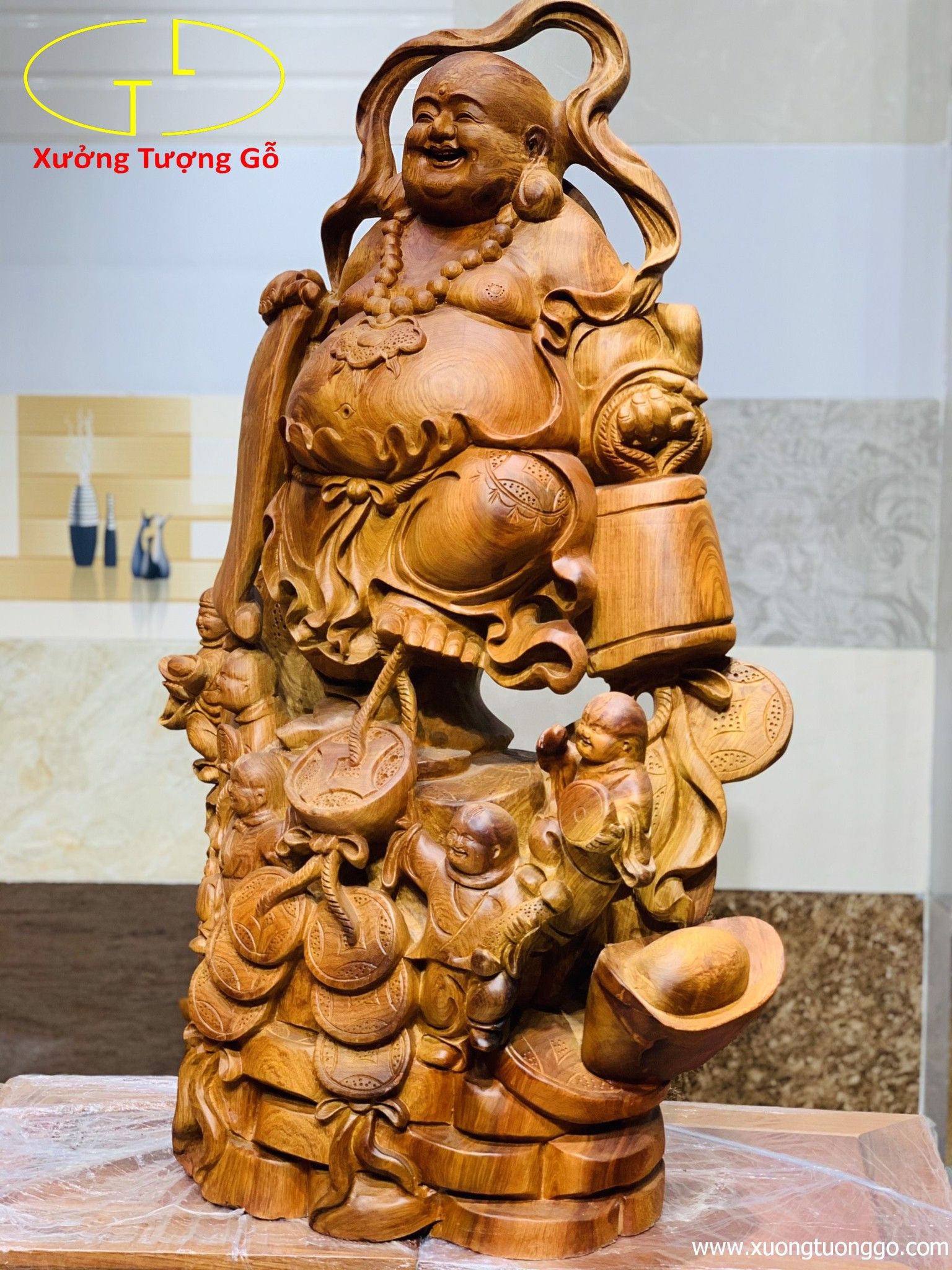 Mời các bác cùng chiêm ngưỡng tác phẩm Di Lặc ngũ phúc đứng tùng vô cùng độc đáo hoàn mỹ và nếu các bác đang tìm kiễm một tác phẩm phong thủy đem lại tài lộc, danh vọng cùng may mắn an vui cho gia đình thì còn chần chờ gì mà không sở hữu ngay cho mình bức tượng Di Lặc ngũ tiểu đứng tùng của Xưởng Tượng Gỗ.
