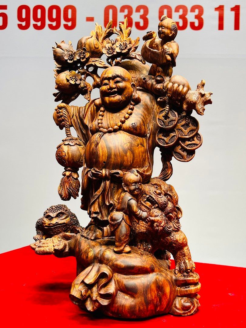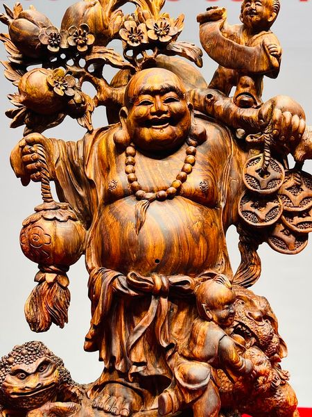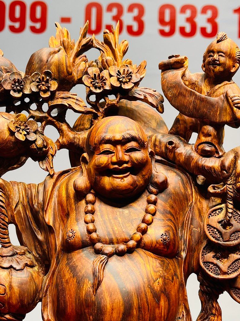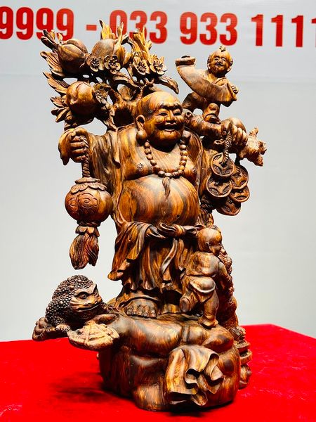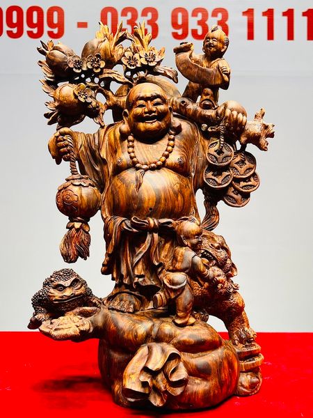 Di Lạc Nhị Tiểu Vác Cành Đào Đứng Bao Tiền Gỗ Sưa