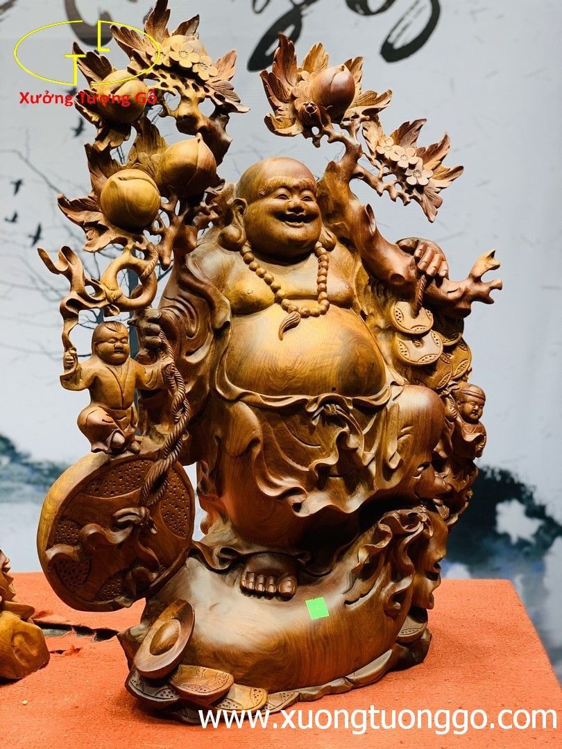 Di lặc nhị tiểu vác đào đứng bao tiền gỗ hương ta.