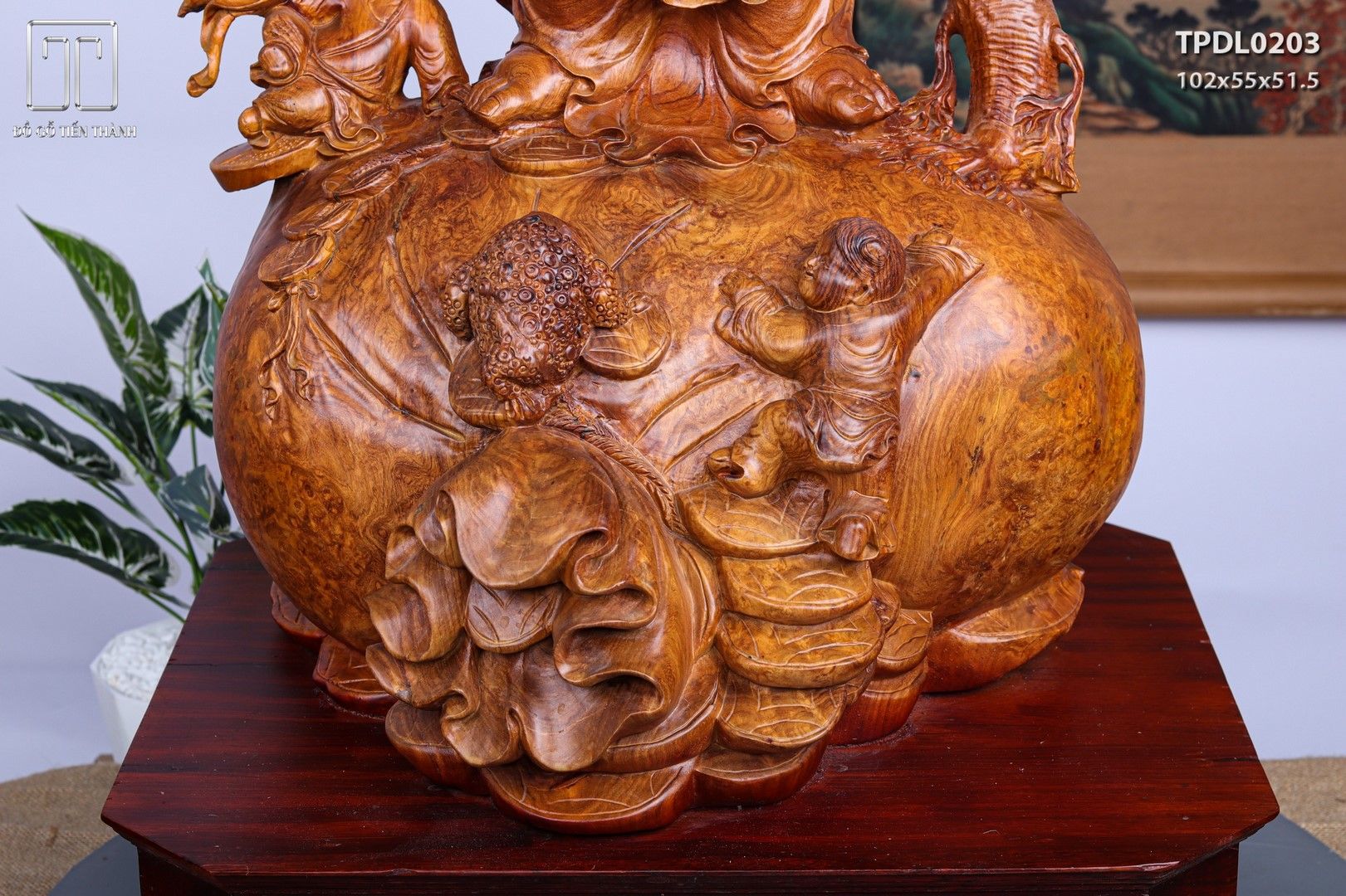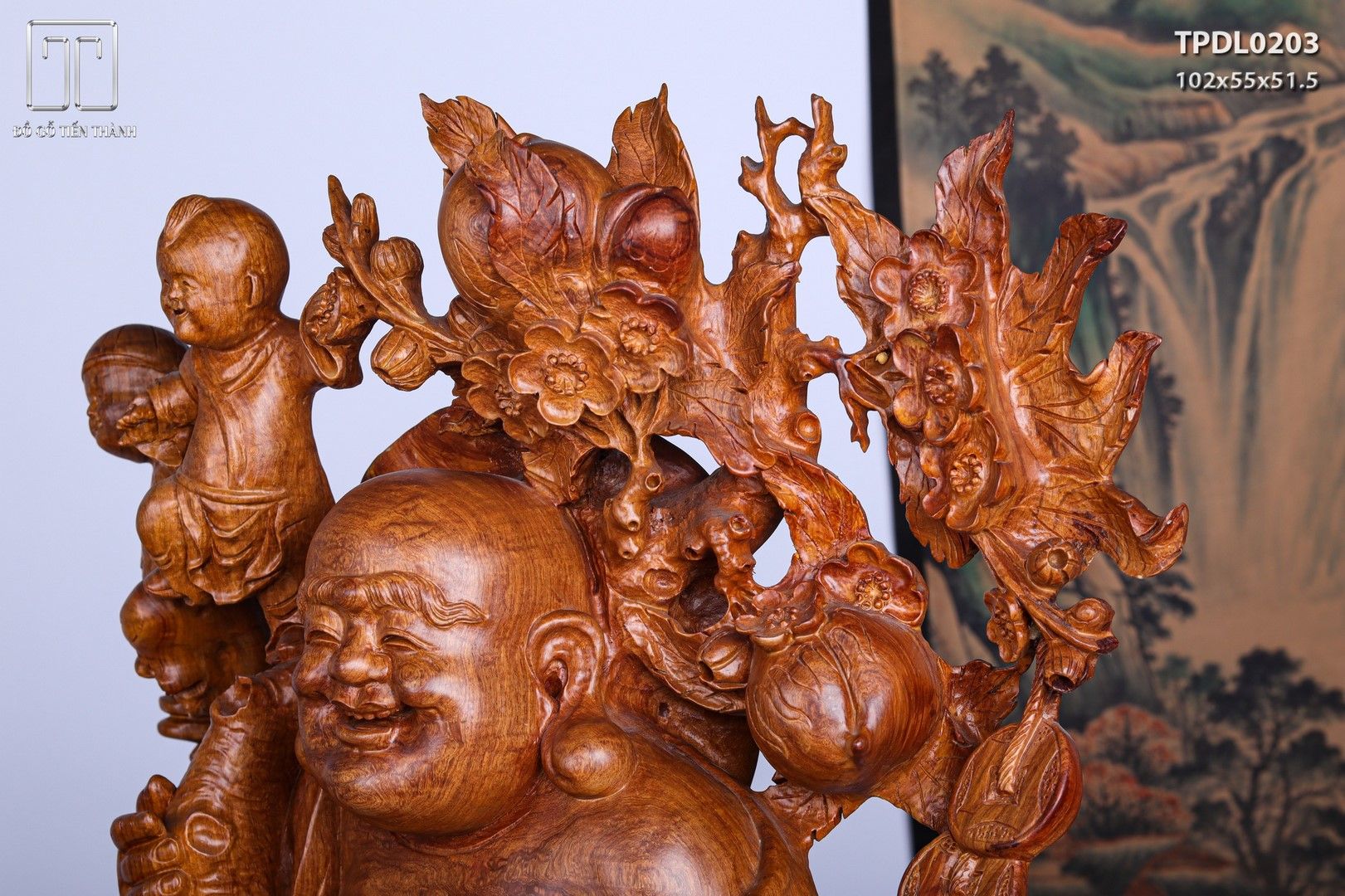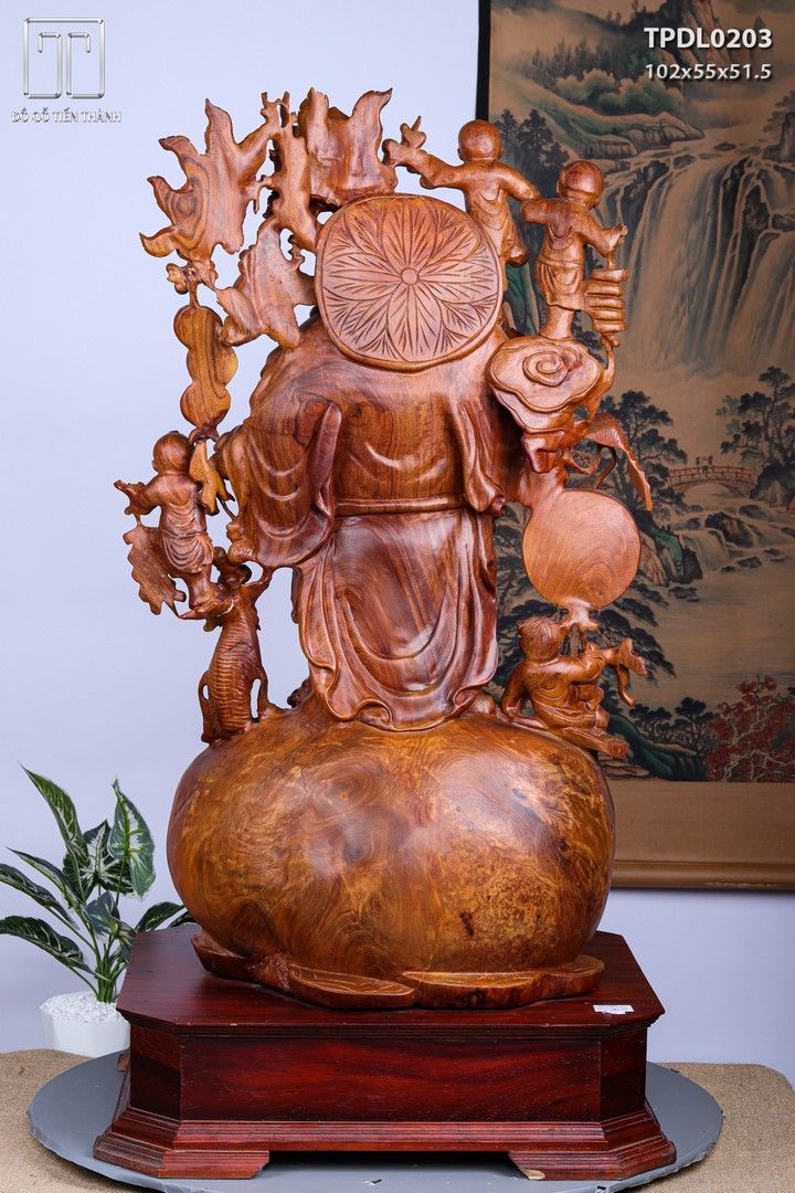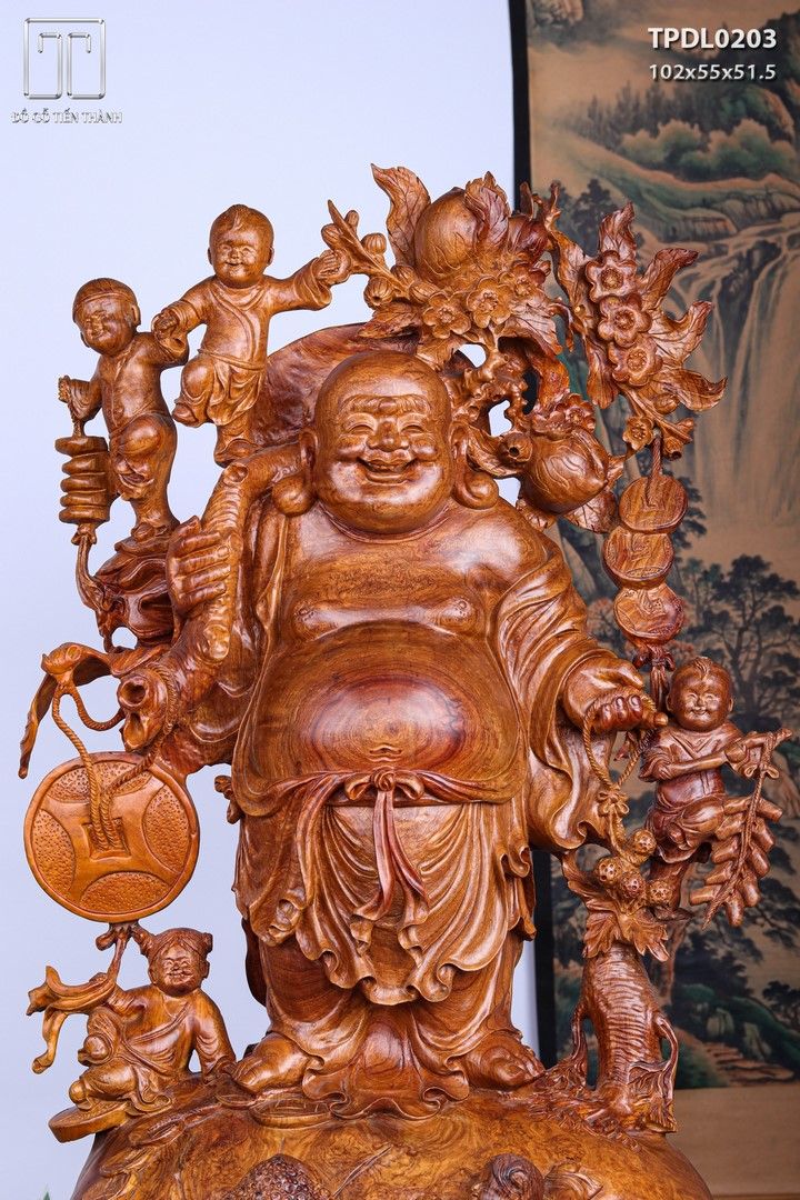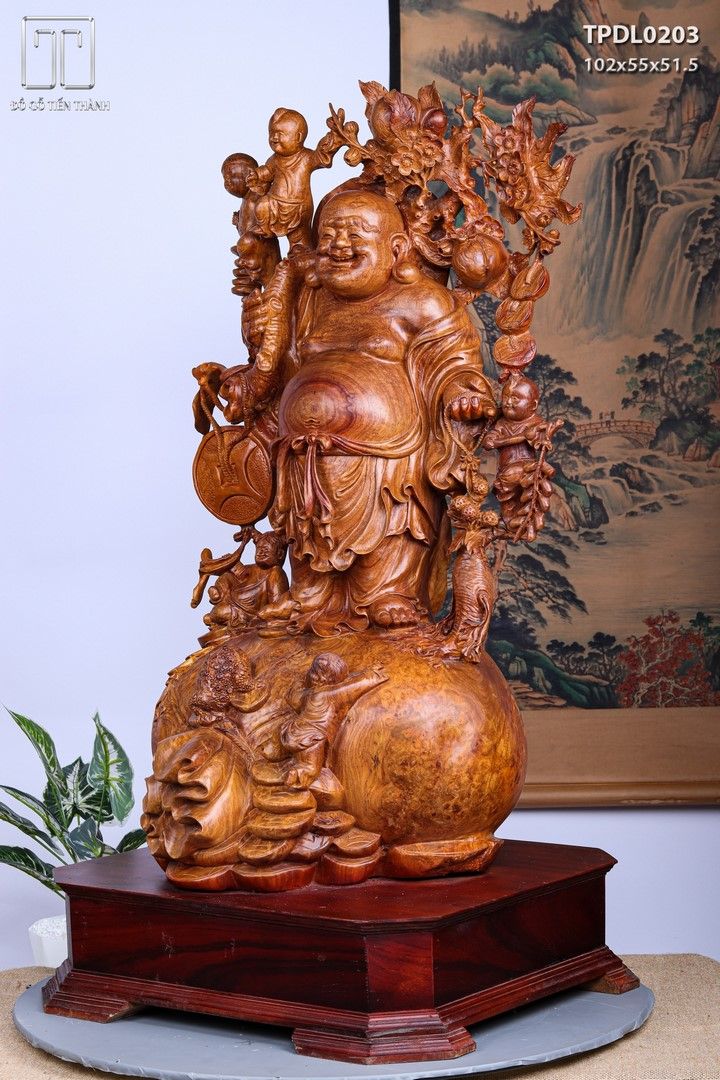 Di Lạc Vác Cành Đào Ngũ Tiểu Đứng Bao Tiền Gỗ Nu Hương