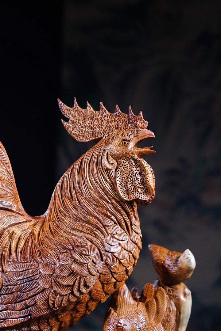 – Con gà được coi là sứ giả của bình minh, xua tan màn đêm, đem lại bình minh ánh sáng và hơi ấm tươi mới. Hơn nữa, nó còn là cầu nối giữa con cháu với ông bà tổ tiên. Chính vì thế mà tượng gỗ gia đình gà có tác dụng trấn trạch, trừ tà giúp xua đuổi ma quỷ, bảo vệ gia chủ khỏi những thứ xấu xa.