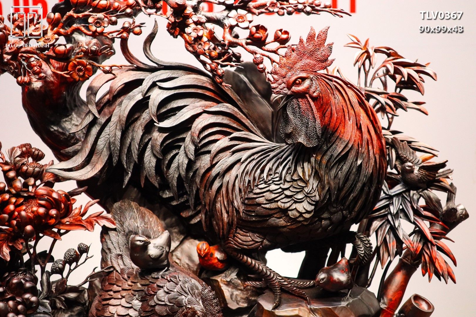 Dù như thế nào, thì bức tượng gỗ gia đình gà cũng đều chung 1 mô típ. Gà trống mạnh mẽ, oai phong đứng hiên ngang che chở cho mẹ con nhà gà phía dưới.