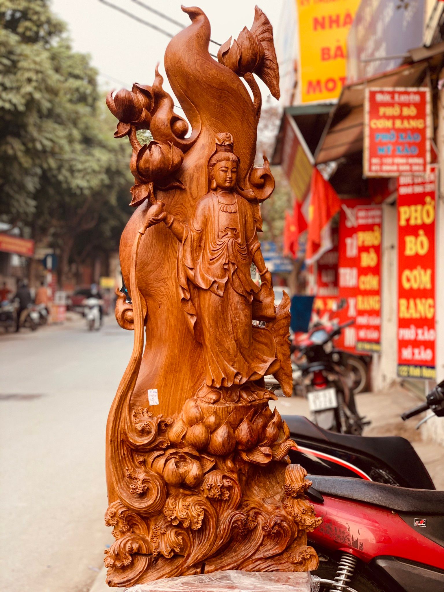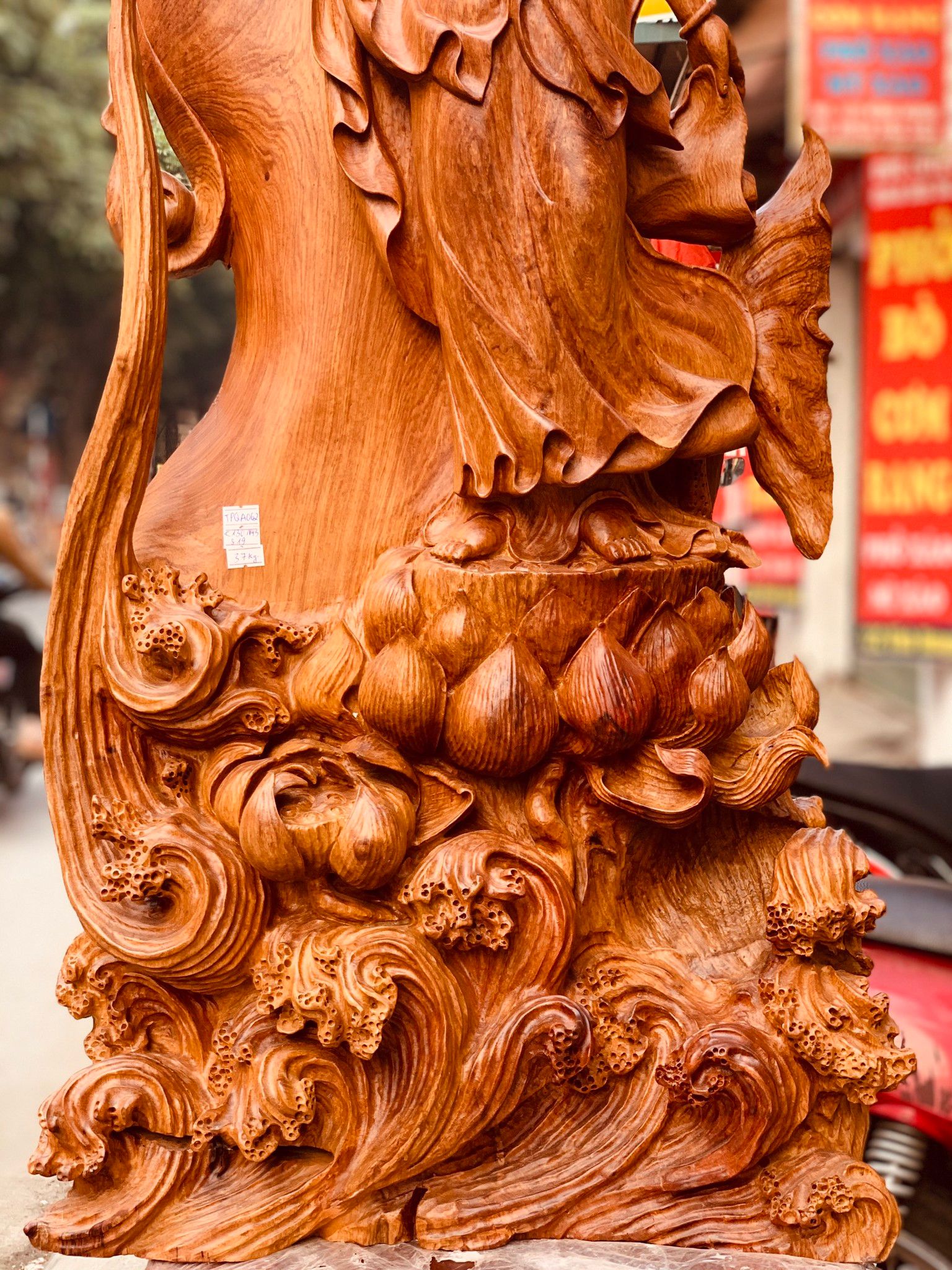 Đặc biệt từng vạt áo, cánh hoa tuy là được đục từ gỗ mà mềm mại phiêu dật y như thật. Đặc biệt những ngọn sóng dưới chân Người chính là được tạo thành từ nước cam lộ, cuồn cuộn dâng trào như nhưng cơn sóng ở biển Nam Hải thể hiện tình thương và hồng ân bao la mà Bồ Tát ban cho thế gian.