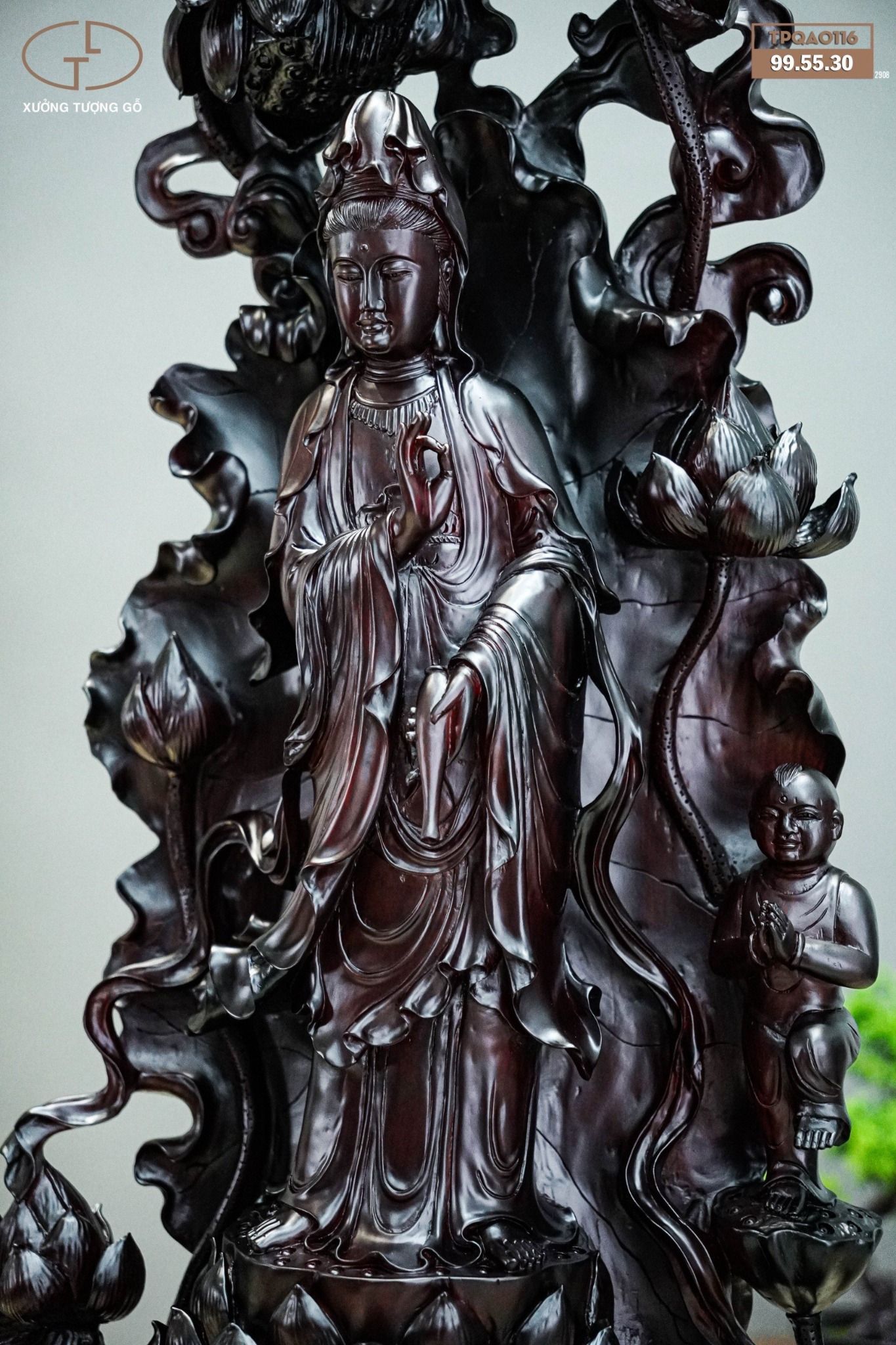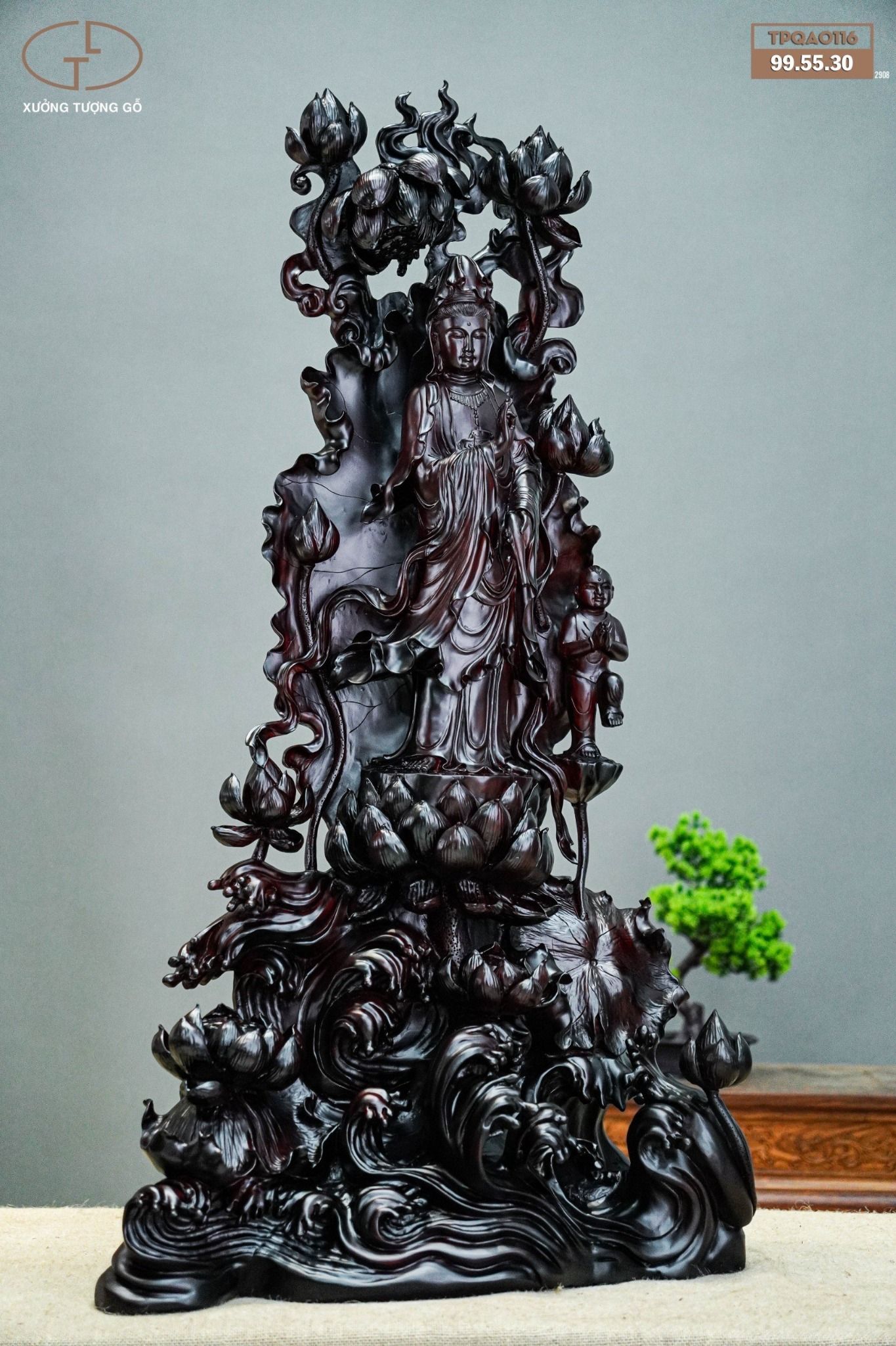 là một những bức tượng phật bà quan âm đẹp nhất tại shop đồ gỗ mạnh sơn, với nét đục và chạm khắc gần như là liền khối. Như anh chị em đã biết, phật bà quan âm, trong tượng gỗ phong thủy, Theo sử sách phong thủy và lời nhân dân cho rằng hình tượng quan âm bồ tát là biểu tượng của điềm lành, lòng từ bi bác ái, hướng thiện, hướng Phật, hoá hung khí, đem lại bình an, giải trừ tai ách cho gia chủ. Vì vậy tượng quan thế âm bồ tát khi thể hiện hình ảnh Phật Bà Quan Âm trong phong thủy, ,tượng quan âm quan trọng nhất đó chính là khuôn mặt, hình tượng tượng phong thuỷ quan âm tự tại, tượng phật bà quan âm bồ tát phải thể hiện được nét mặt từ bi, hiền hậu, khi nhìn vào có cảm giác dễ chịu, an lành.