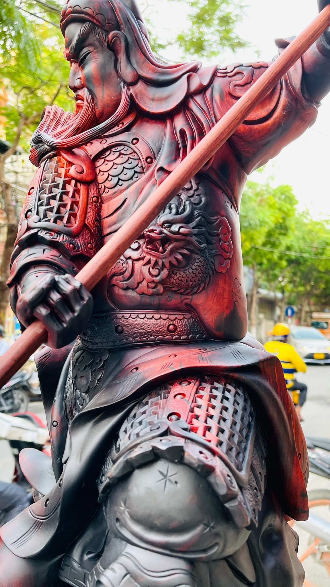 Quan công luôn xuất hiện với hình ảnh khí khái mãnh liệt, gương mặt cương quyết có phần dữ dằn, mặt đỏ và dâu dài, trên tay luôn cầm long đao trong tư thế sẵn sàng. Người ta quan niệm rằng Tượng Quan Công có gương mặt càng dữ thì hiệu quả bảo vệ càng mạnh.