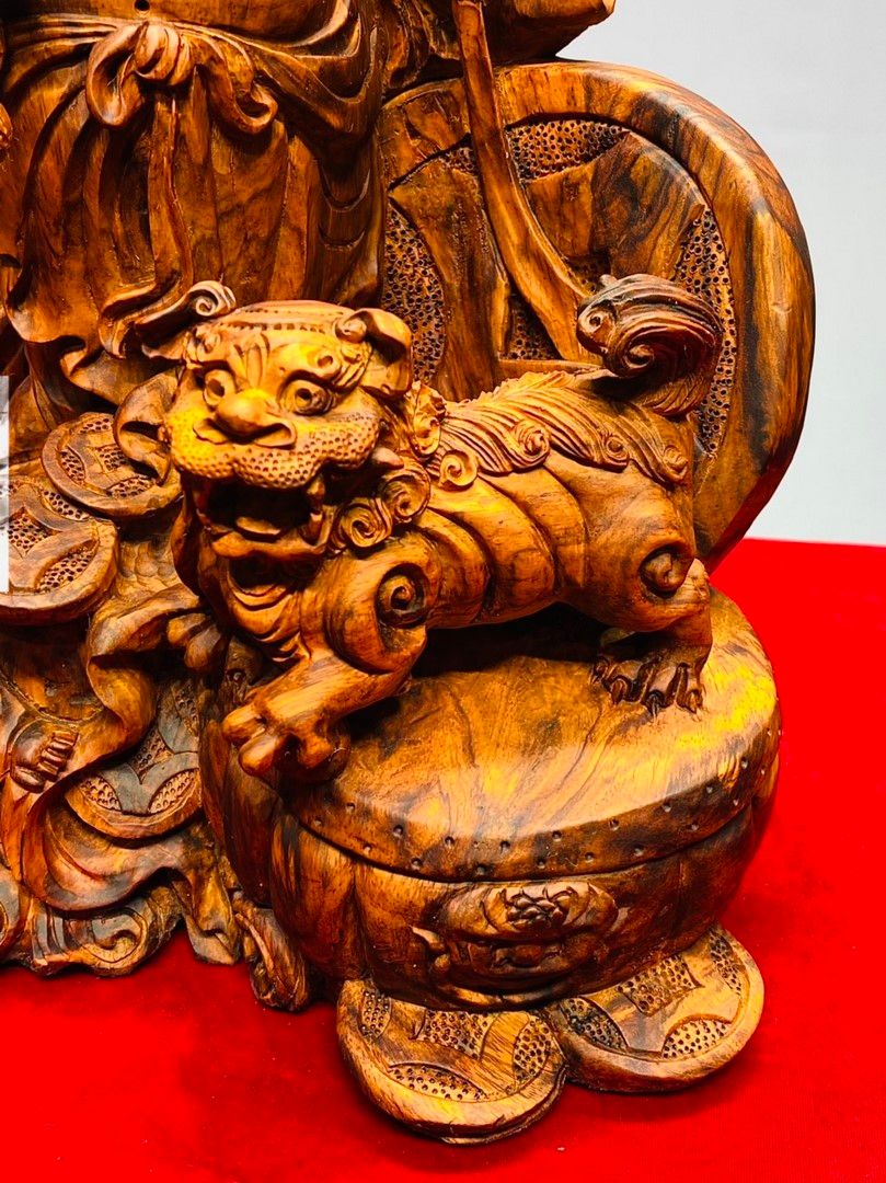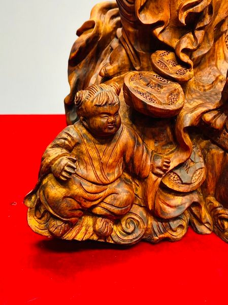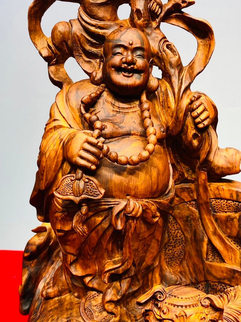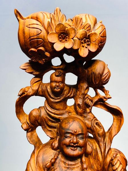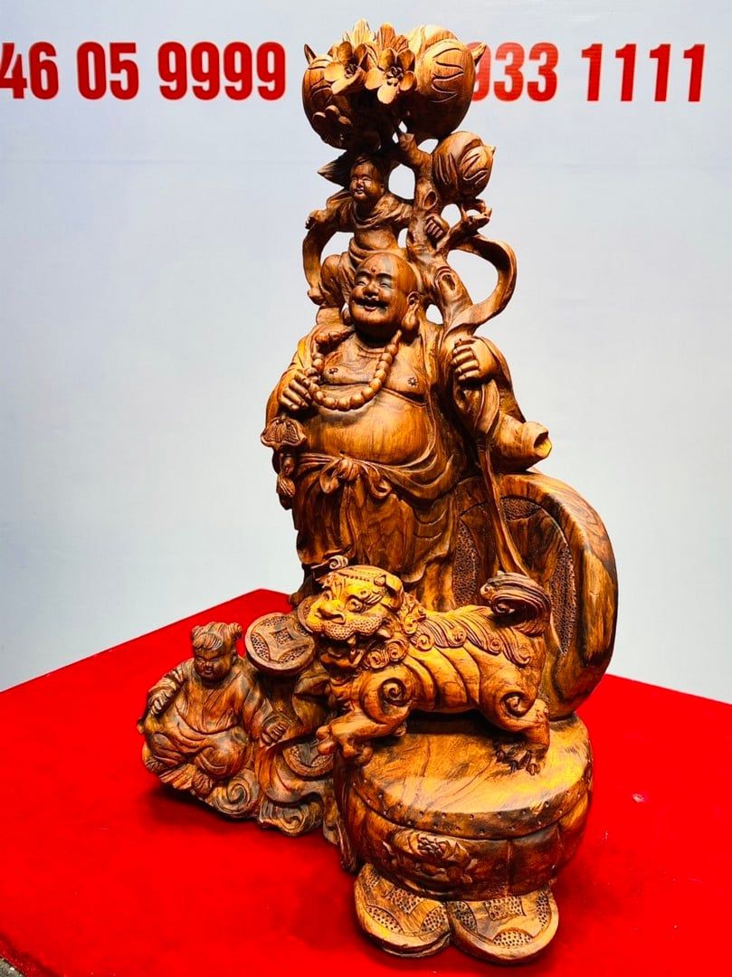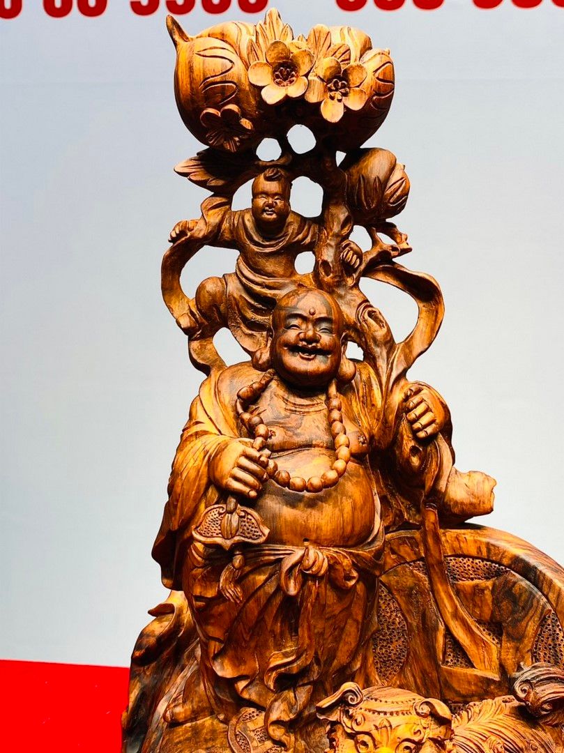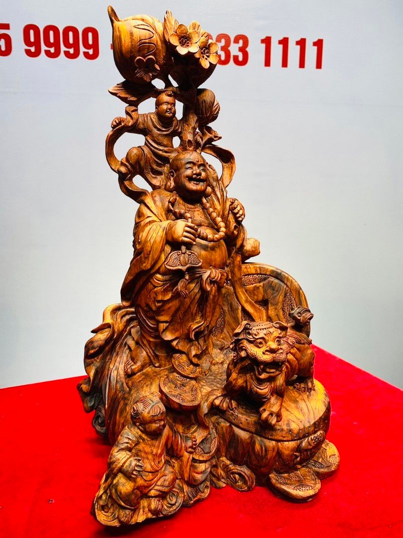 Tượng Di Lạc Nhị Tiểu vác cành đào đứng Nghê Gỗ Sưa