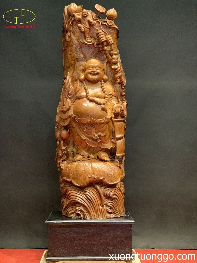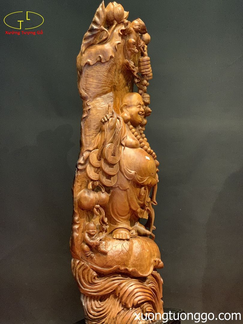 Tượng Phật Di Lặc Tam Tiểu Đứng Lá Sen Gỗ Hương